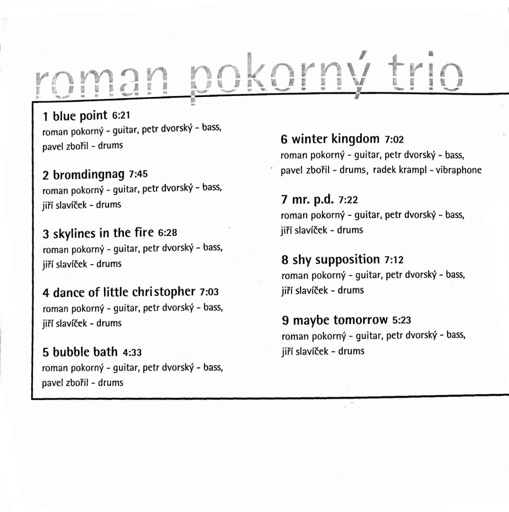Brněnský kytarista Roman Pokorný má dar psát nápadité, žánrově otevřené, leč jazzově pointované melodie a prostřednictvím kytar jim s velkou dávkou uvolně-nosti vdechnout duši. Sotva se před několika lety ocitl na pódiu s pražskými jazzmany, už mu Arta vydala album a vsadila na něj jako na svého koně. Rázem se o Romanovi začalo mluvit jako o nejosobitějším jazzovém talentu mladé generace. Už před rokem a půl, jen co byla deska jeho kvartetu Magic Holidays venku, v rozhovoru pro Harmonii říkal: „Chtěl bych si postavit trio, ale ještě nevím jak to udělat, abych nehrál jako někdo. Aby za mnou nechodili lidi s pochvalou: Hraješ jako Scofield nebo: Ty, to bylo jak od Methenyho. Je těžké vyrovnat se s tím, že kytara má tolik možností využití.“ Zajdete-li dnes na Trio Romana Pokorného do Jazzklubu, zjistíte, že se v jeho komorním zvuku našel zcela suverénně.