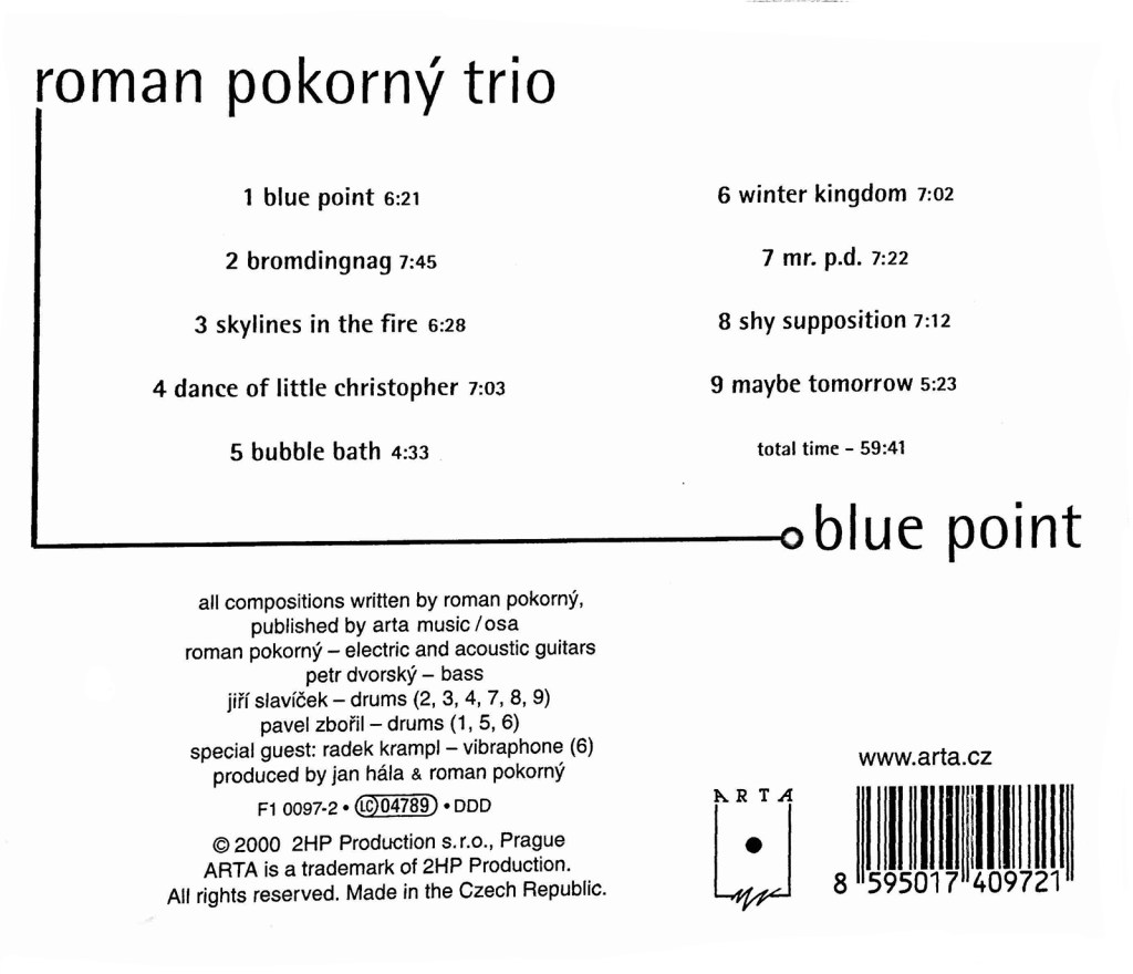 Po Magic Holidays a Jazz Perception vydal vloni kytarista Roman Pokorný své třetí sólové album u Arty a rozšířil tak svou diskografii o další titul, jaký by si mohla zařadit do katalogu snadno i nad- národní firma. Jde převážně, i když nikoliv výhradně, o svěží souljazzový rytmický koberec, jemuž dominují vlastní nápaditá témata a, jak se na žánr sluší, i dlouhometrážní melodická kytarová sóla. Do auta ideální životabudič. A také jde konečně o plnohodnotný záznam tria, s nímž Roman strávil na pódiích spousty času. Deska je dokonce triu Pokorný – Dvorský – Slavíček připsána, celý titul zní Roman Pokorný Trio: Blue Point. Výjimkou jsou tři skladby, kdy za bicími hostuje pro zpestření Pavel Zbořil a tu nejromantičtější z nich Winter Kingdom instrumentálně dobarvuje ještě vibrafon Radka Krampla. Mezi příjemně plynoucími a v náladách se pěkně doplňujícími skladbami vysloveně září pětidobý Dance Of Little Christopher, dále třeba rytmická funková mašinka Bubble Bath a překvapením je akustická kytara v závěrečné jakoby countryovce Maybe Tomorrow. Ve vtipně nazvané Mr. P.D. (skladbu Mr. P.C. věnoval kdysi Coltrane Paulu Chambersovi) si kromě parádního kráčejícího basu opravdu pěkně zasóluje i adresát tohoto titulu, kontrabasista Petr Dvorský. Roman Pokorný je jedním z mála místních jazzmanů, kteří se dokáží o vlastní diskografii adekvátně starat, v tomto případě s podporou 2Hp Arty.