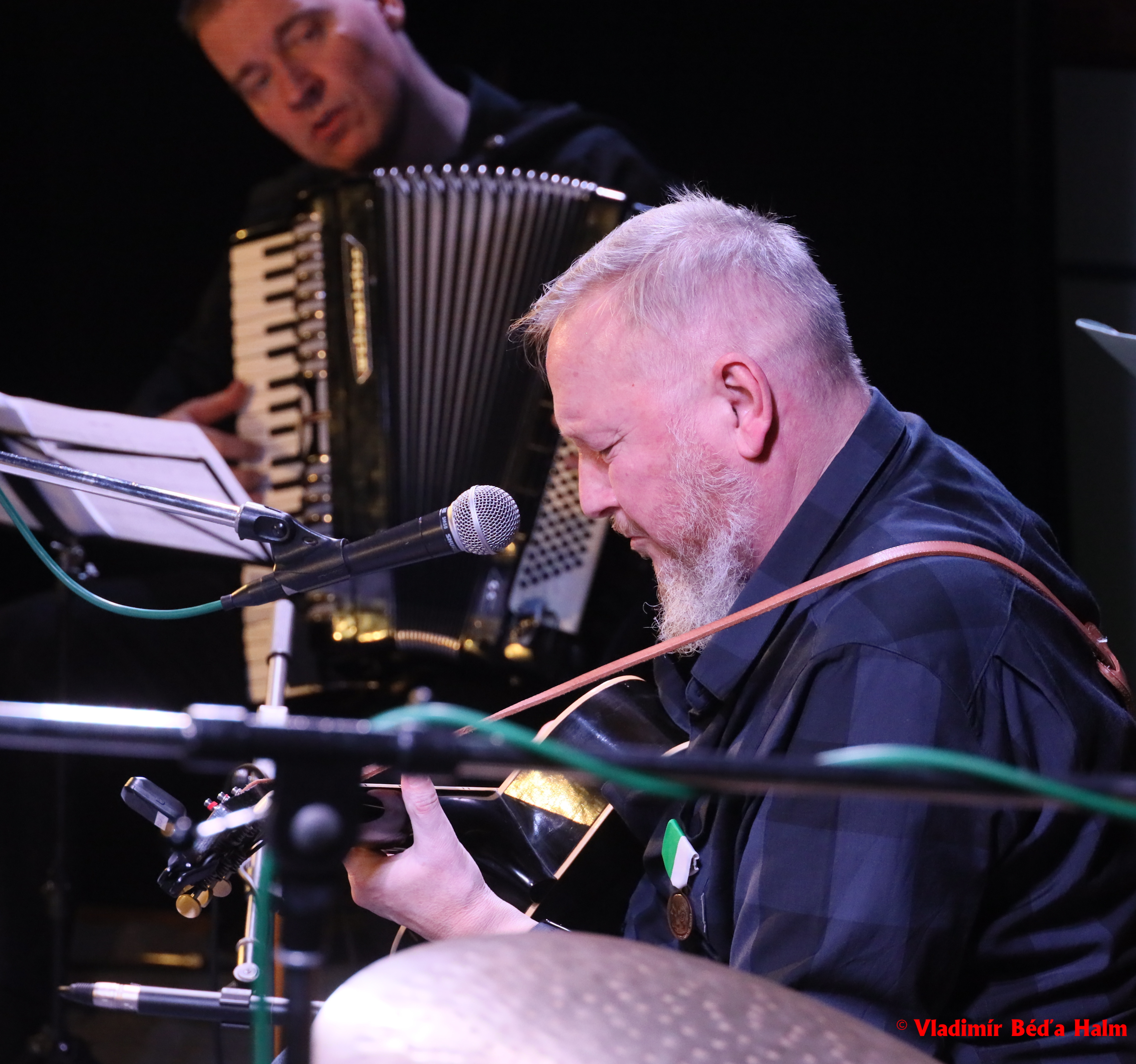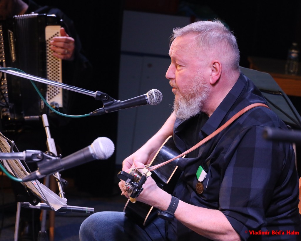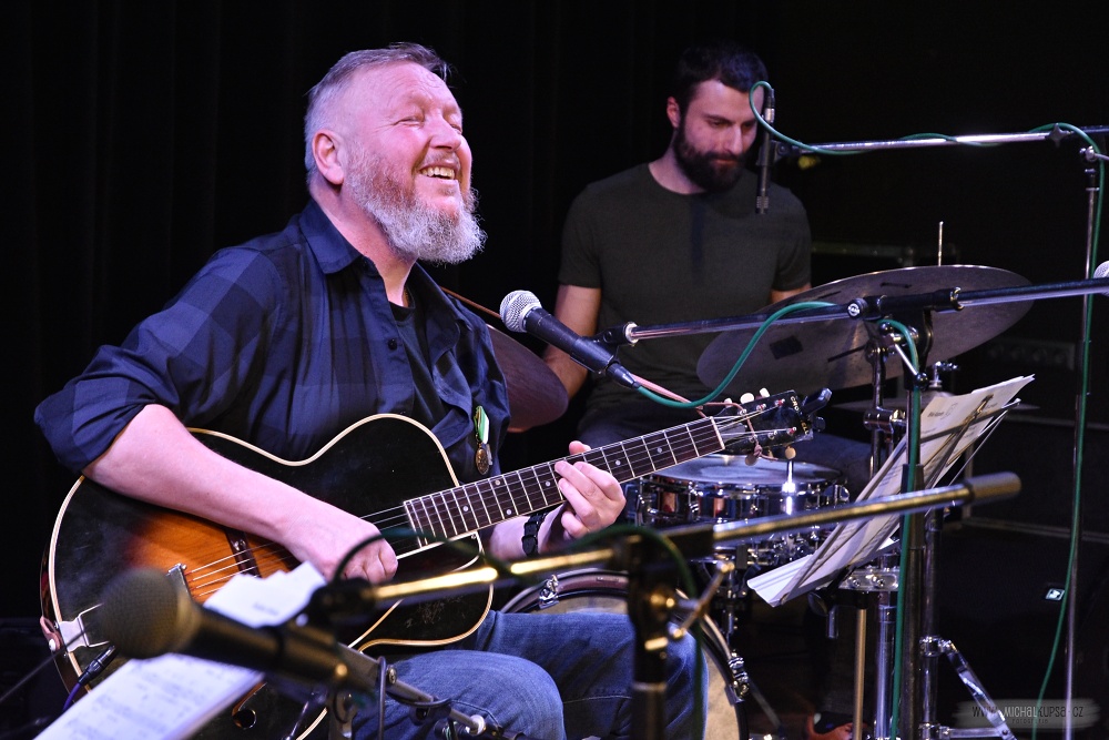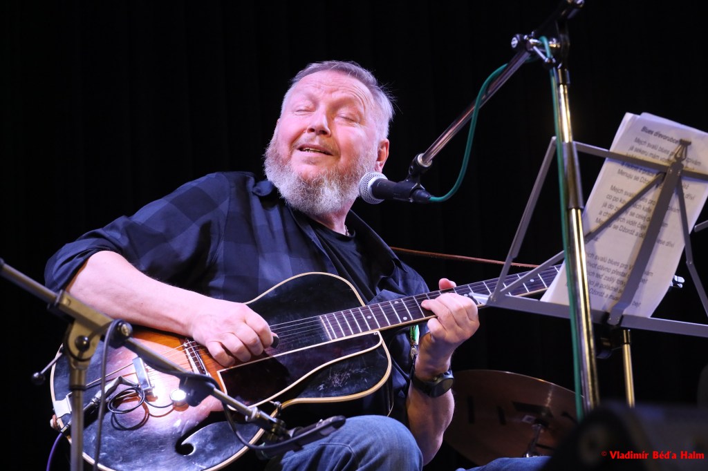 Křest taky nebyl úplně easy, protože jsem za tu dobu, kdy jsem se musel věnovat administraci všechno téměř zapomněl. Jsem sice zvyklý hrát i zpívat na koncertech, ale úplně jiný žánr, kdy zpívám anglicky a doprovázím víceméně volně. V trampské muzice jde o kontinuální doprovod a ještě k tomu zpěv v češtině. České texty jsou většinou daleko víc obsažné a taky komplikovanější. To by bylo ovšem na delší rozbor. Taky jsem prodal všechny svoje gibsonky abych projekt podpořil. Já vím někomu na tom jestli hraje na flattopa, nebo na archtopa nezáleží, ale ať to vezmete jak to vezmete, mě to zkrátka víc sluší s gibsonkou. Takže jsem koupil v Belgii starého Cromwella.